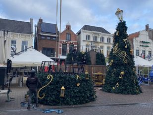 · Hij is 12,5 meter hoog, hangt vol met duizenden lichtjes en heeft een spectaculaire piek: de kerstboom, die sinds vrijdag op de Markt staat.