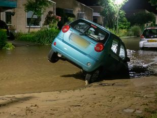 · Een auto is maandagnacht in een sinkhole beland, nadat een gesprongen waterleiding de straat volledig blank zette.