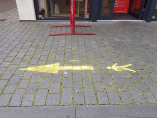 · Plots waren ze er. Op de trottoirs van de Bergse winkelstraten zijn dinsdag gele pijlen aangebracht, die een looprichting aangeven.