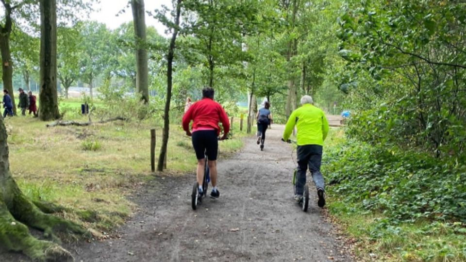 Bij warm weer gaan de sporters van DS Training op de fiets of de step naar het bos om daar in de schaduw te sporten (foto: DS Training)