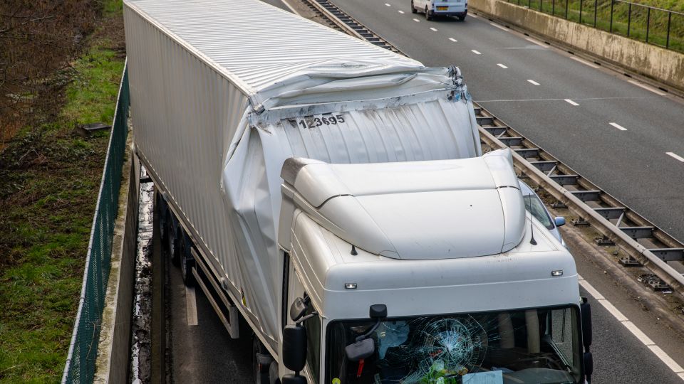 De vrachtwagen raakte door de botsing zwaar beschadigd. De chauffeur is nagekeken door ambulancepersoneel. Het is onduidelijk of de man naar het ziekenhuis moest.