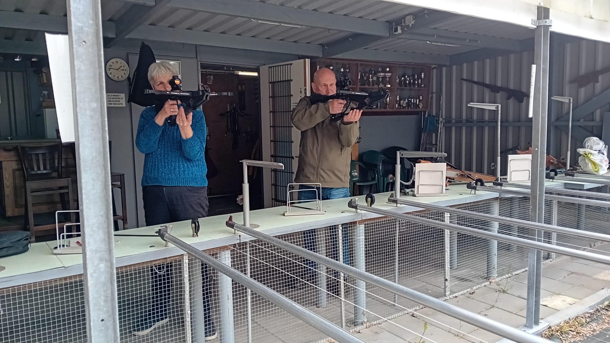 En inderdaad, achter de kroeg ligt een heuse schietbaan van de kruisboogvereniging Excelsior. “De baan is wel van ons. Maar het onderhoud doet de vereniging helemaal zelf”, vertelt Rian. Waarna Ton en Annemieke van Excelsior niet aarzelen om een demonstratie te geven.