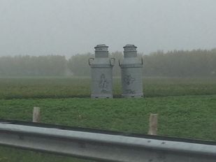 · De grote melkbussen langs de A58 bij Wouw zijn beklad door vandalen. De meer dan 5 meter hoge bussen staan…