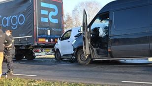 · Door de klap kwamen de busjes tegen elkaar en tegen de vrachtwagen vast te zitten. Hoe het ongeluk kon gebeuren is niet bekend.