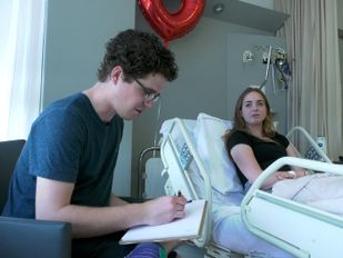 · Met een tekenbord onder zijn arm en een etui met potloden in zijn hand loopt Wouter Goudswaard over de kinderafdeling…