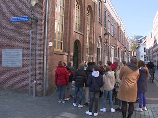 · In het kader van herdenken met 4 mei hebben leerlingen van de Montessorischool bloemen weggelegd bij de synagoge.