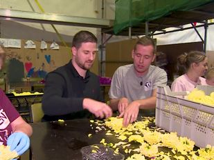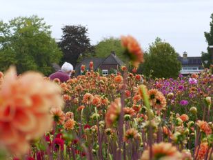 · Vrijwilligers van buurtschap Markt in Zundert zijn druk bezig met het plukken van de vele dahlia's.