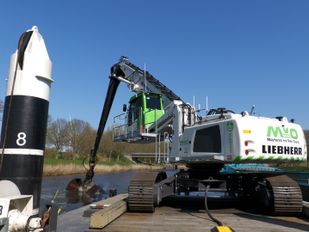 · Een grote kraan op een ponton die bagger van de bodem van het Mark-Vlietkanaal schept, is niet alleen een imposant…