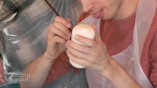 · Met zijn blik op het doel gericht, werpt Bram Beening vol vertrouwen de kaas op het ijs en begint Paul…