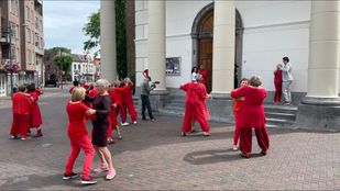 · Senioren van top tot teen gekleed in het rood, een camera en een grote speaker trokken woensdagochtend flink wat bekijks…